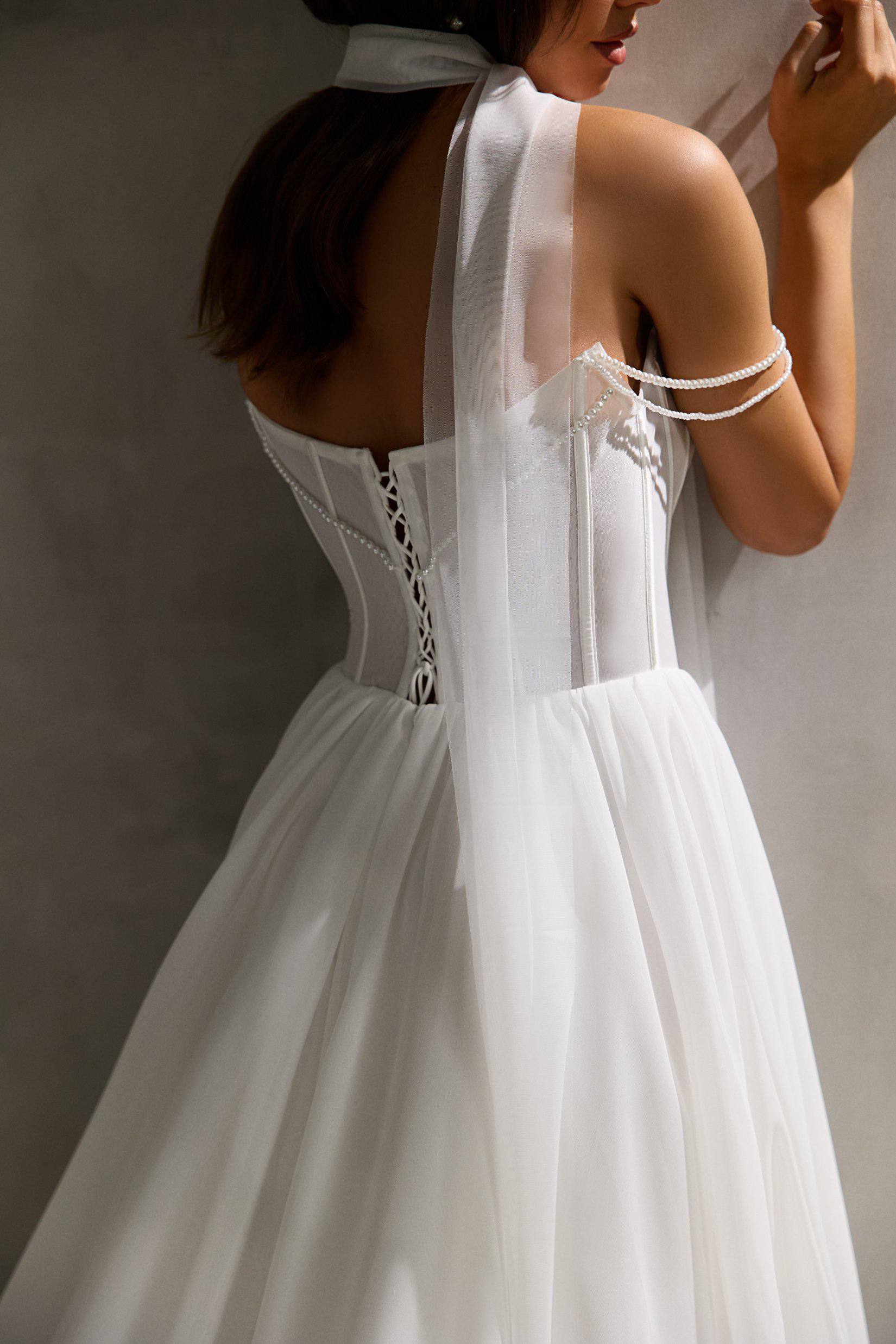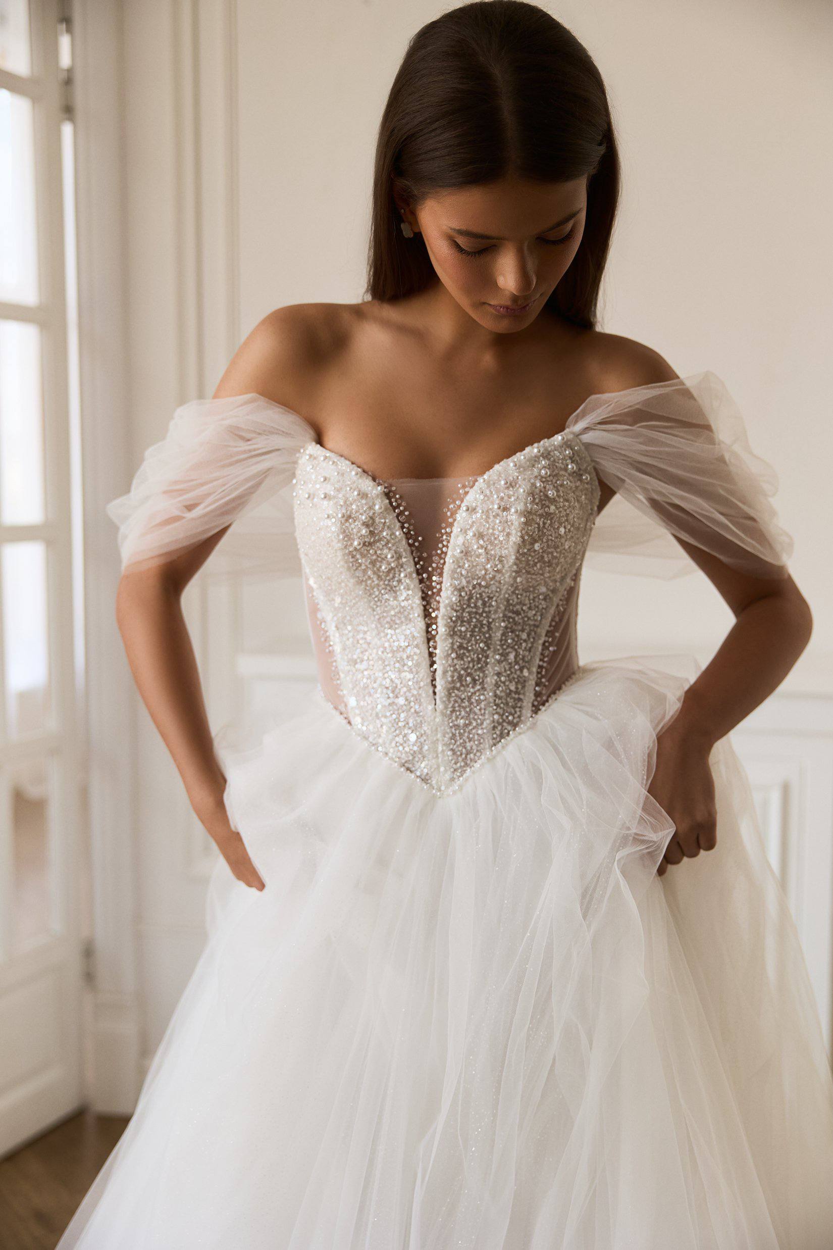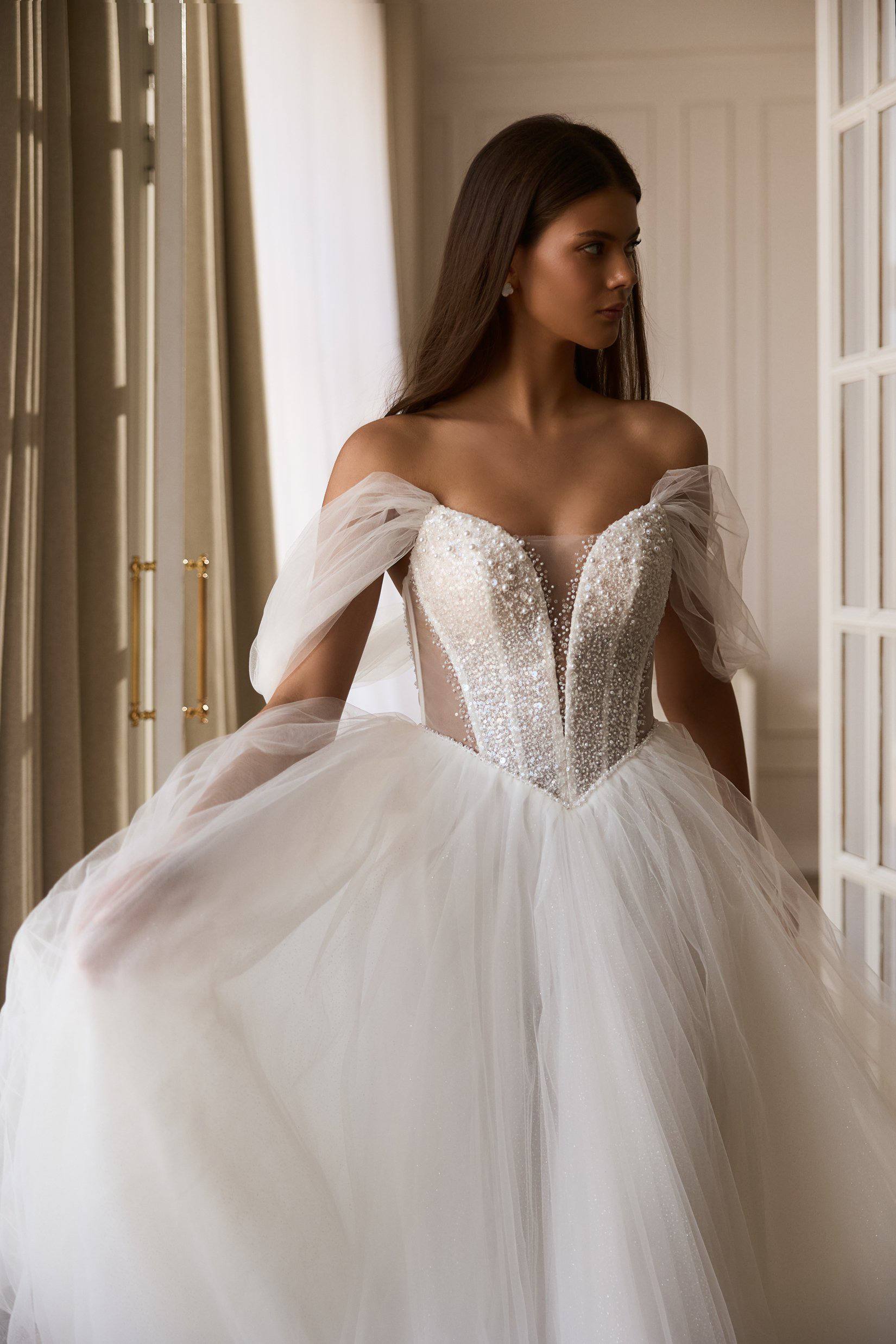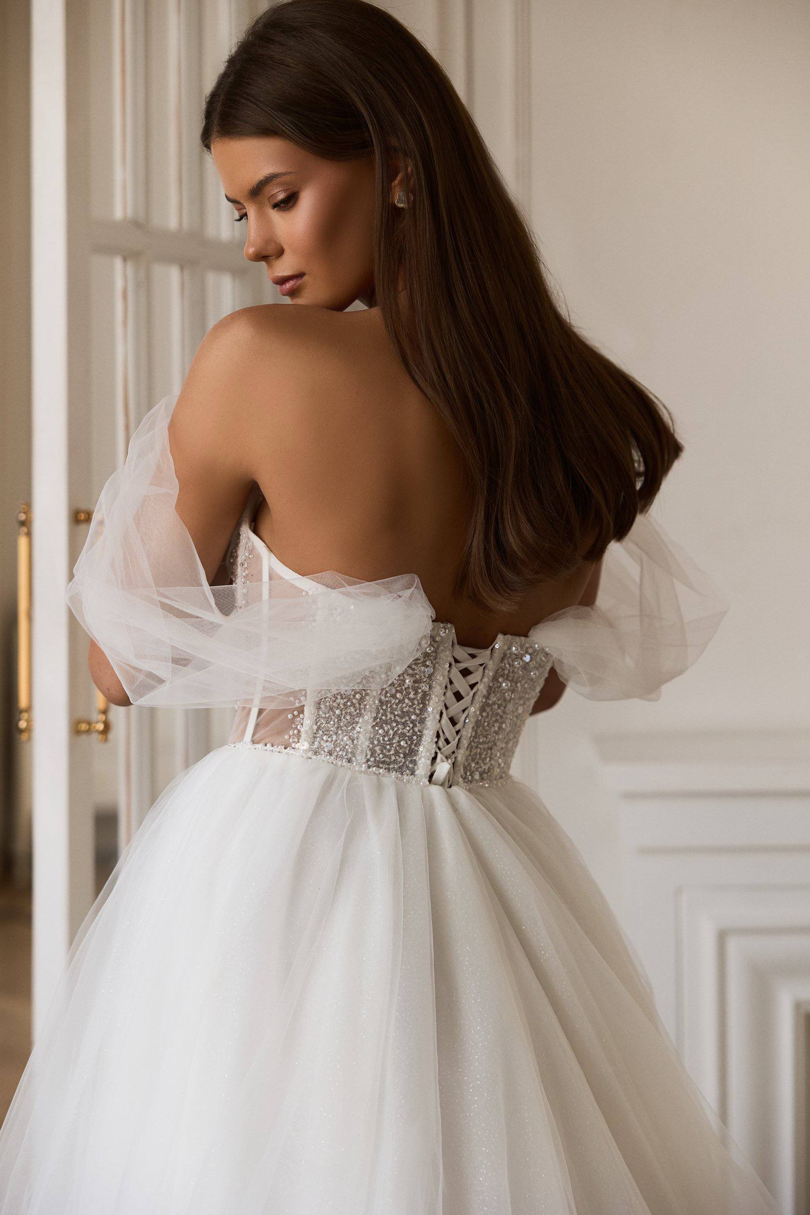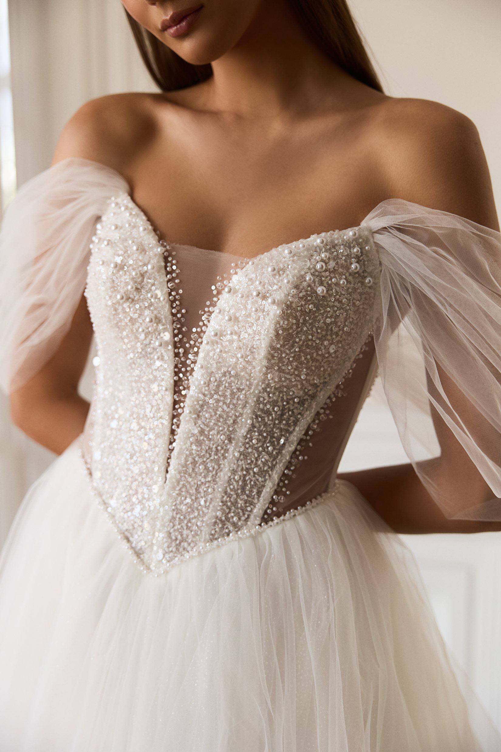 Свадебное платье на корсете. Лиф с мысом по переду, с глубоким декольте из кружева с жемчугом и пайетками, по талии бисерная тесьма. На спинке шнуровка. Юбка из фатина, пышная, молочная. Второй слой с блеском.