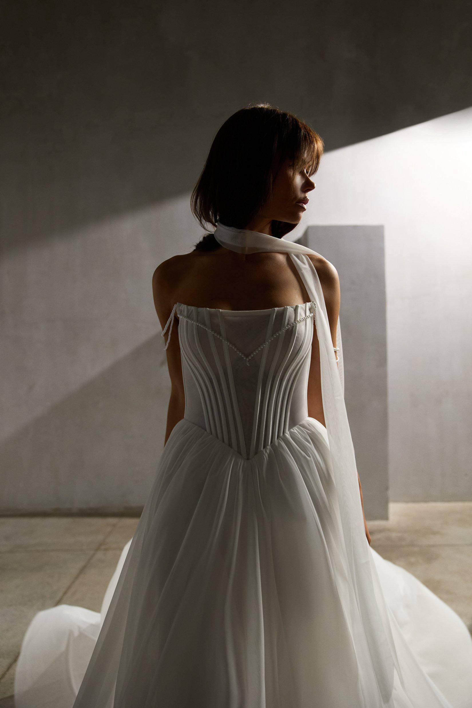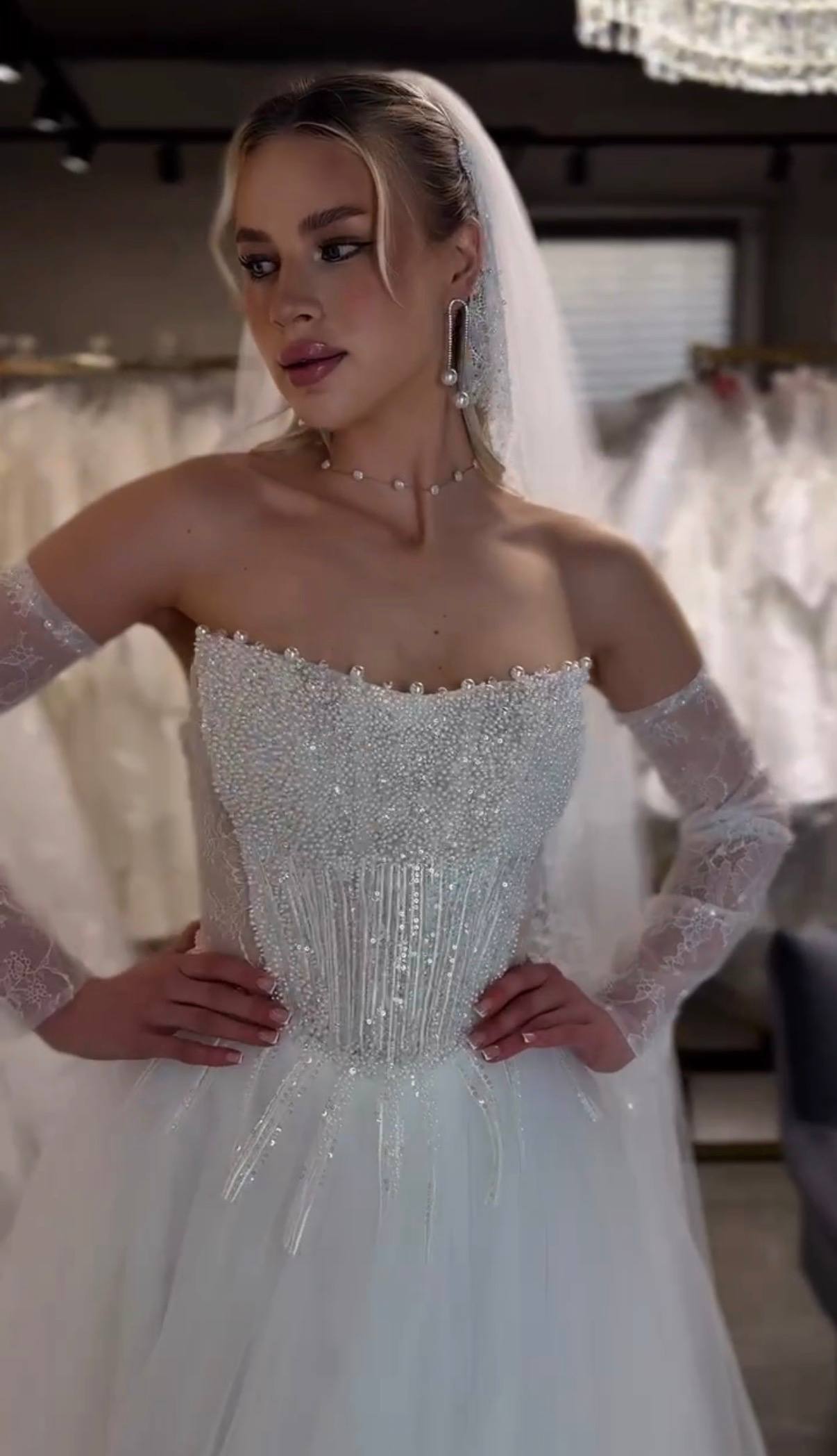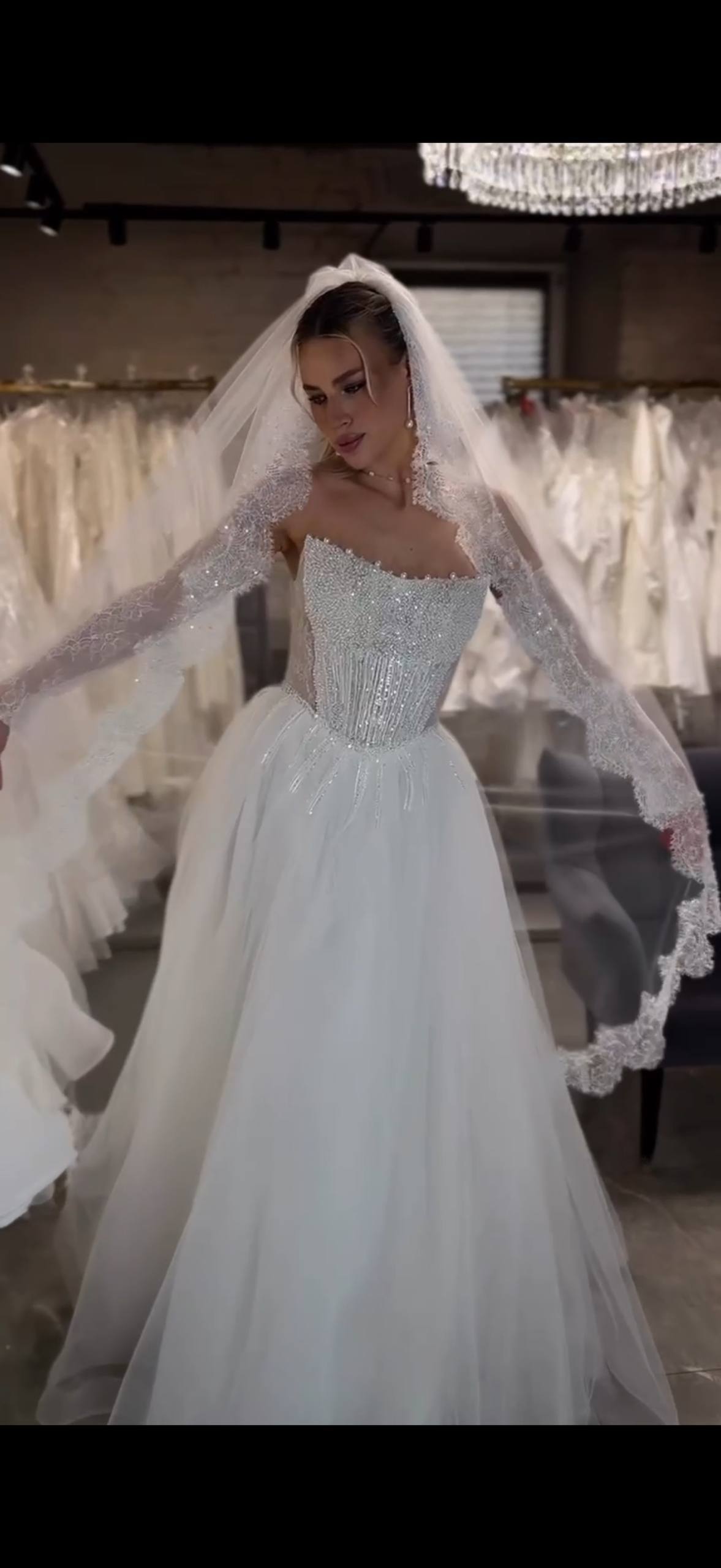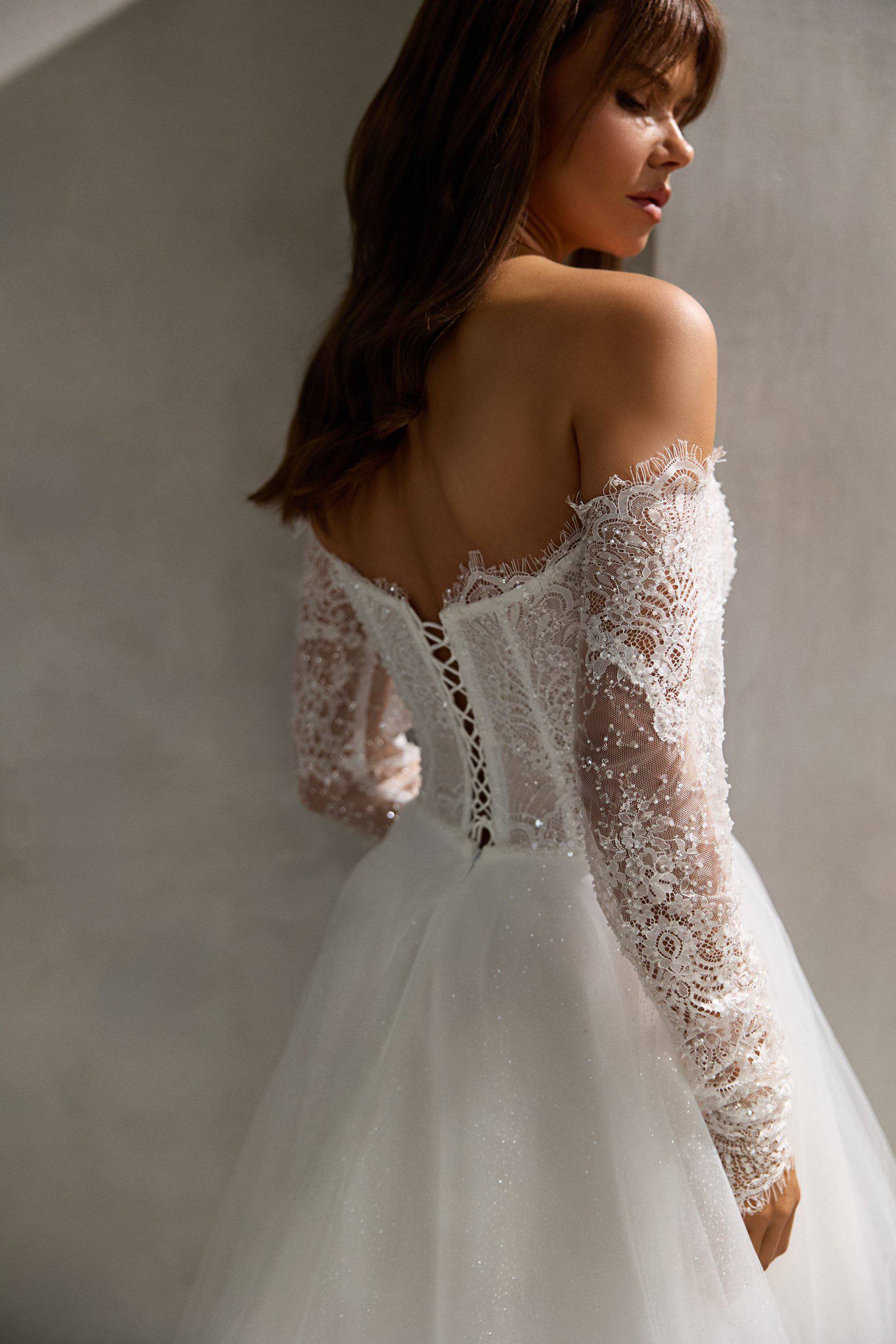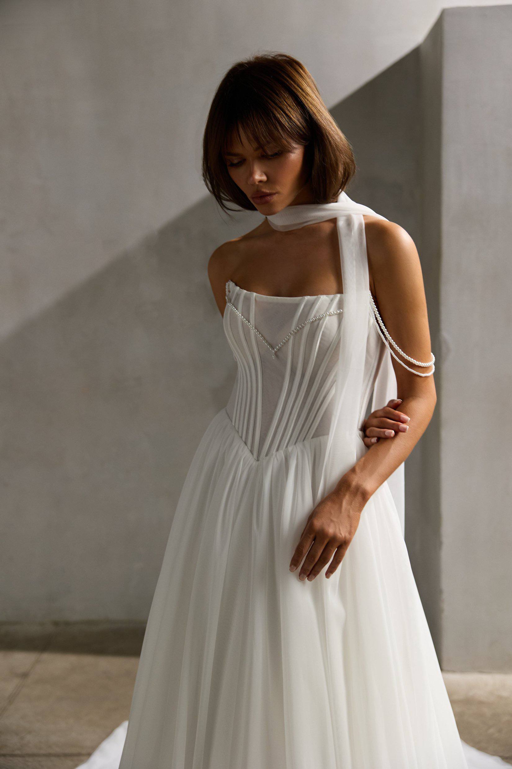 Свадебное платье на корсете. Лиф с мысом по переду, с глубоким декольте из кружева с жемчугом и пайетками, по талии бисерная тесьма. На спинке шнуровка. Юбка из фатина, пышная, молочная. Второй слой с блеском.
