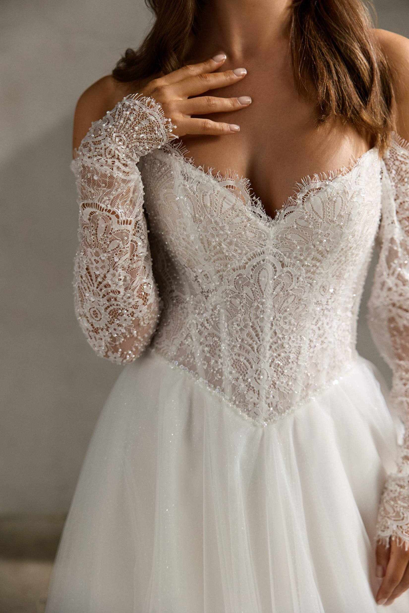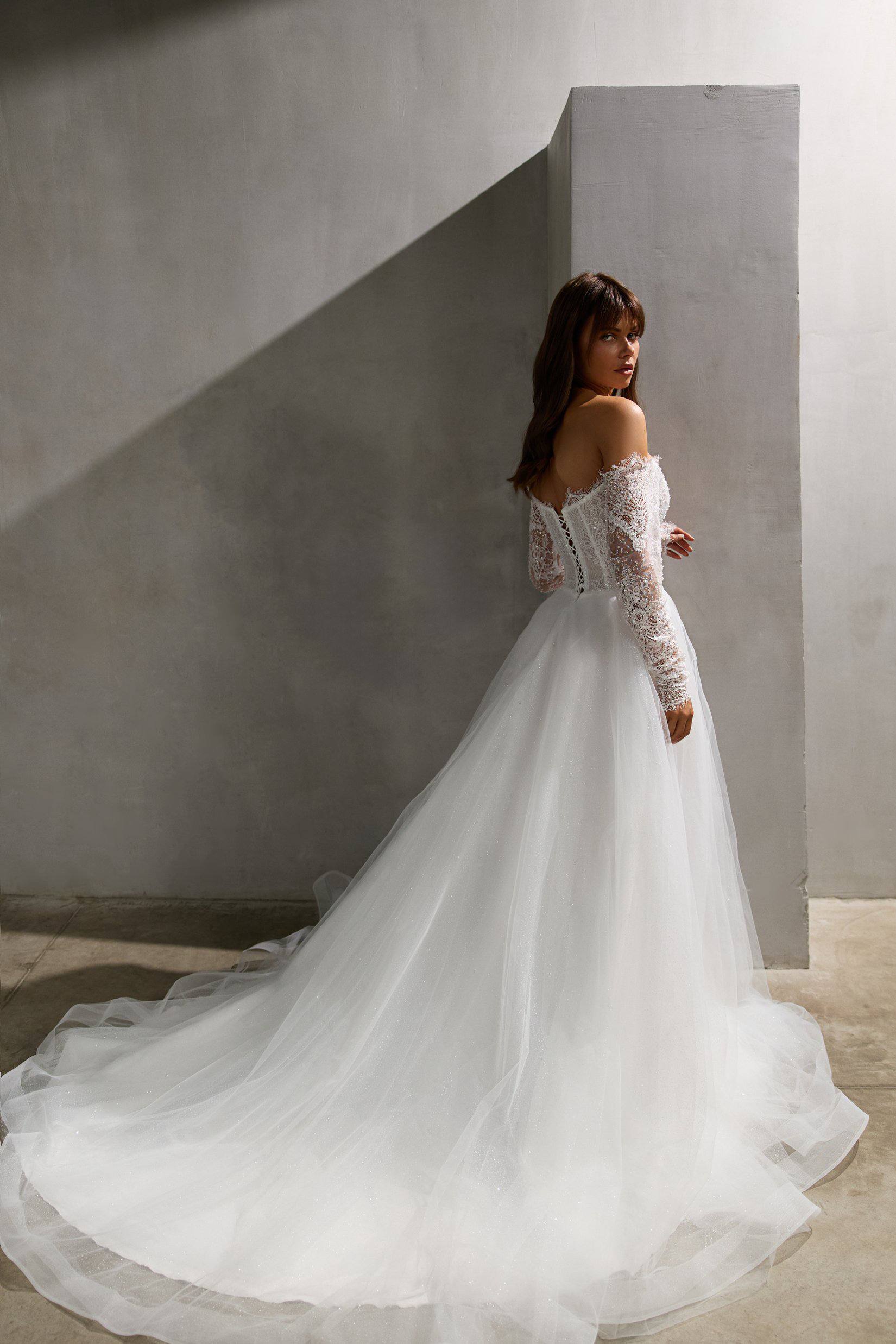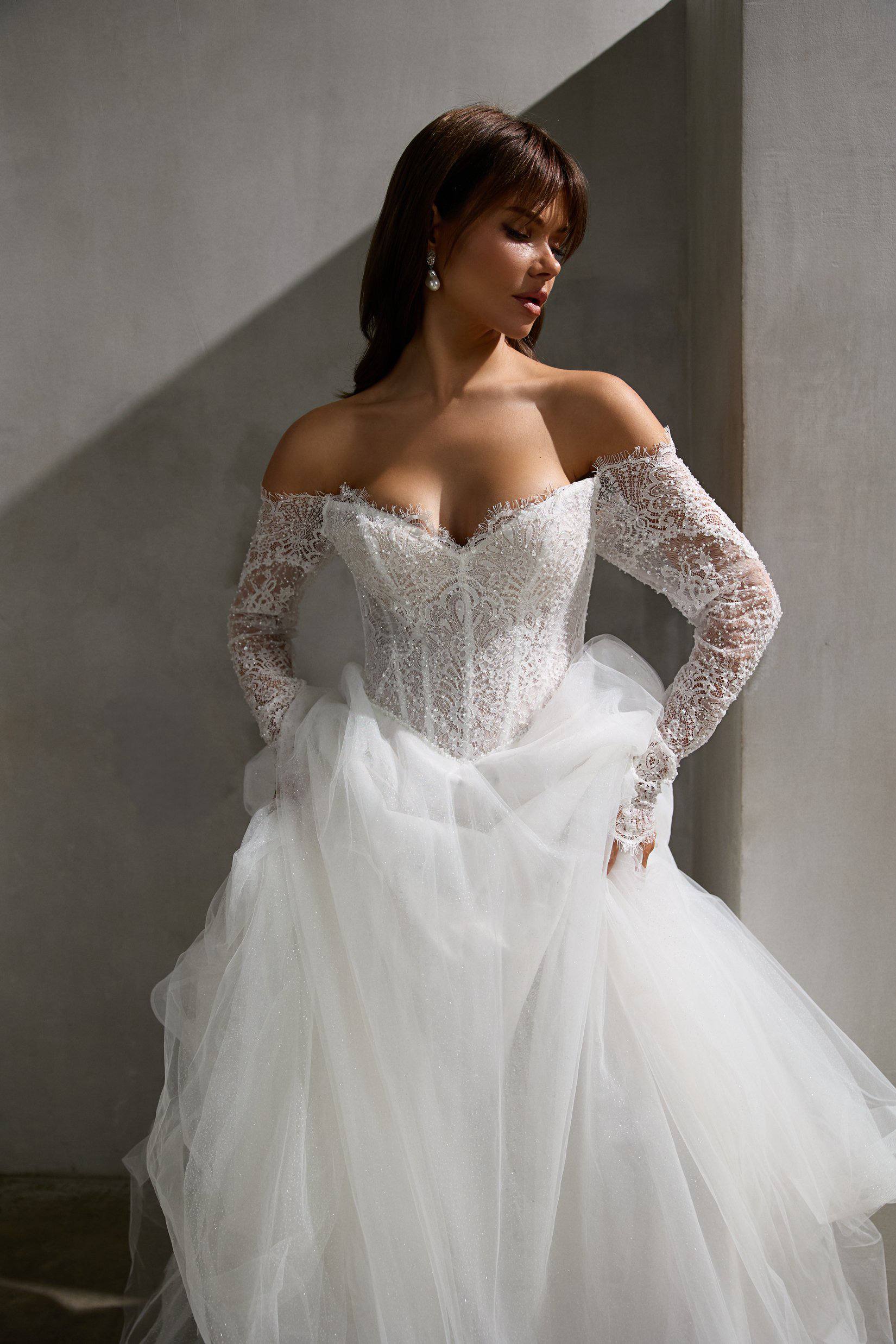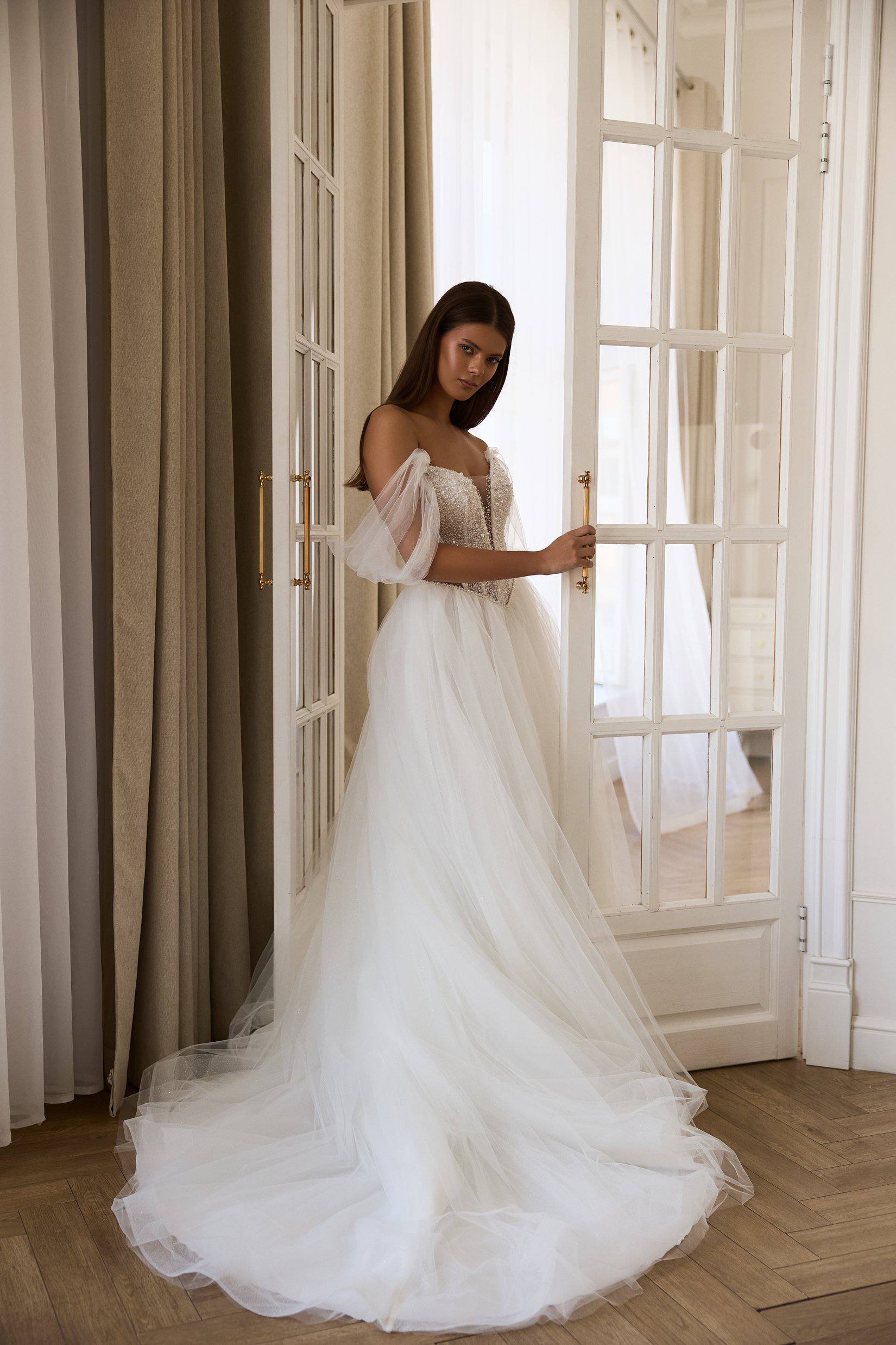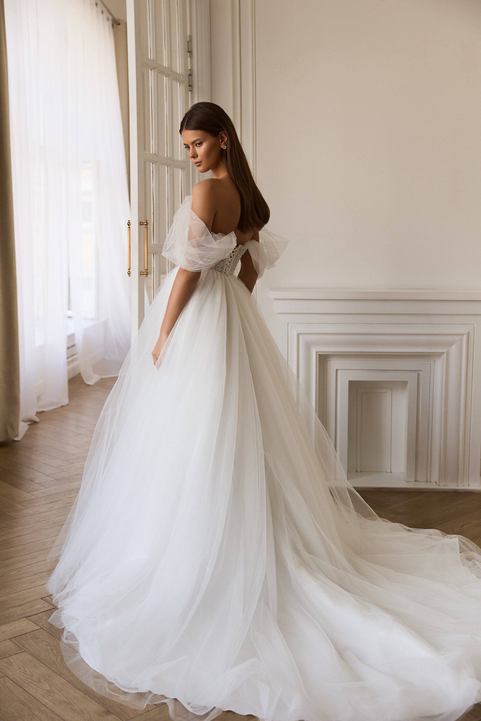 Свадебное платье на корсете. Лиф с мысом по переду, с глубоким декольте из кружева с жемчугом и пайетками, по талии бисерная тесьма. На спинке шнуровка. Юбка из фатина, пышная, молочная. Второй слой с блеском.