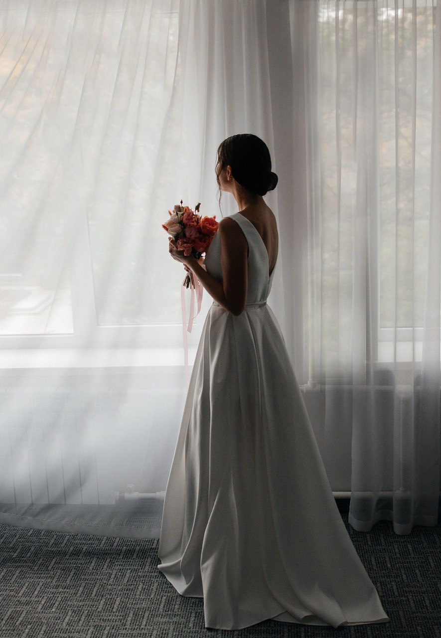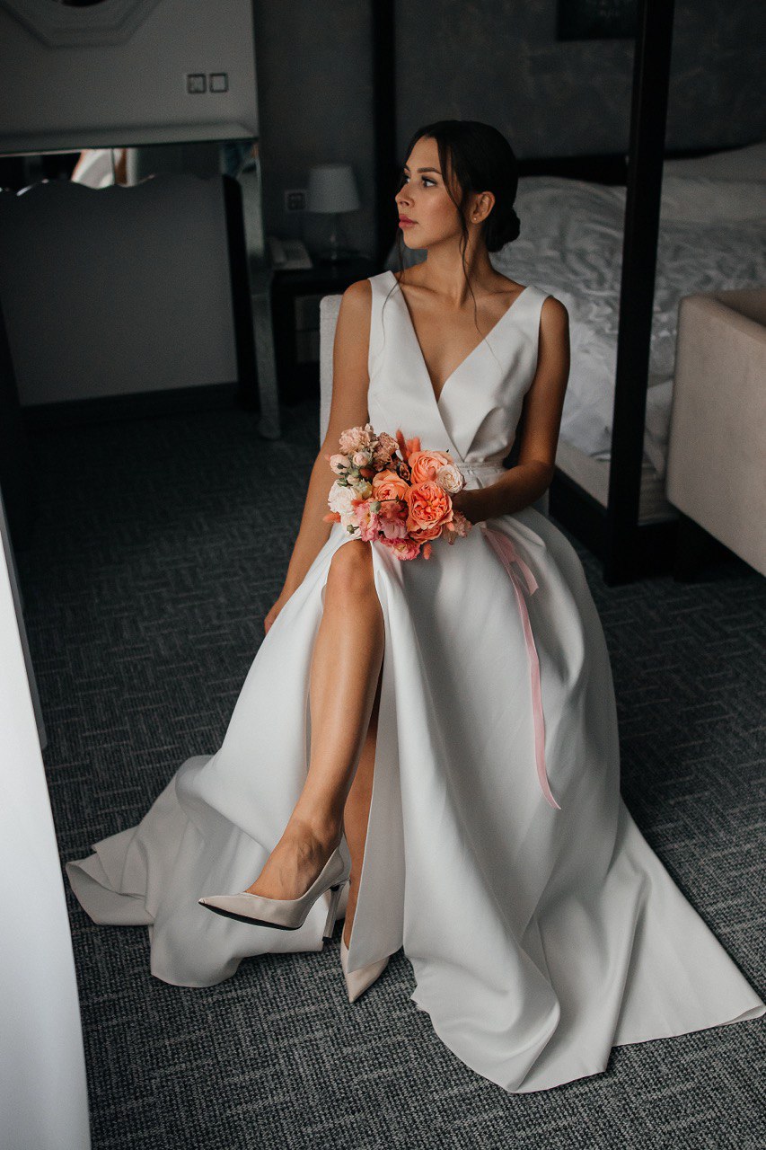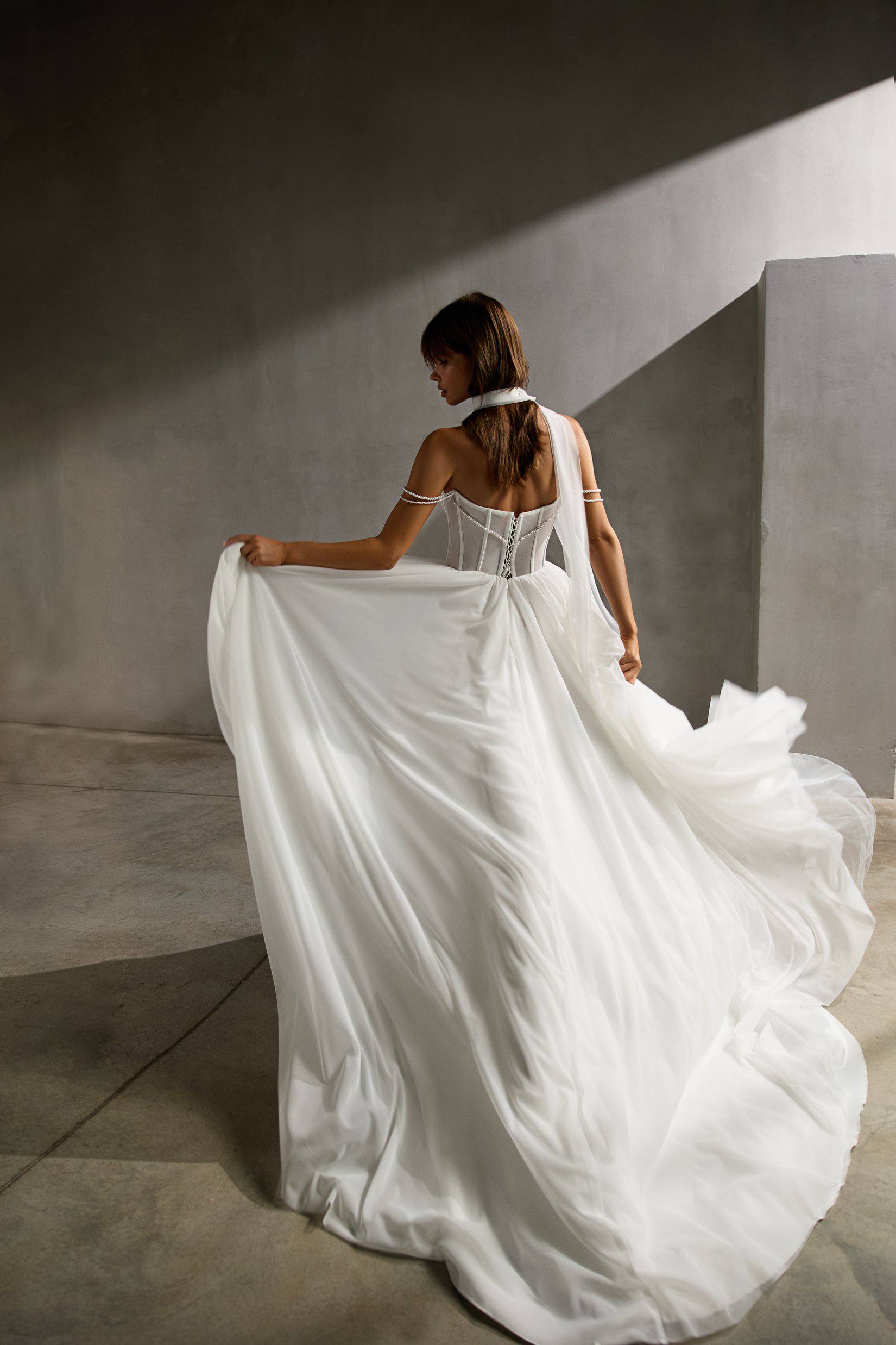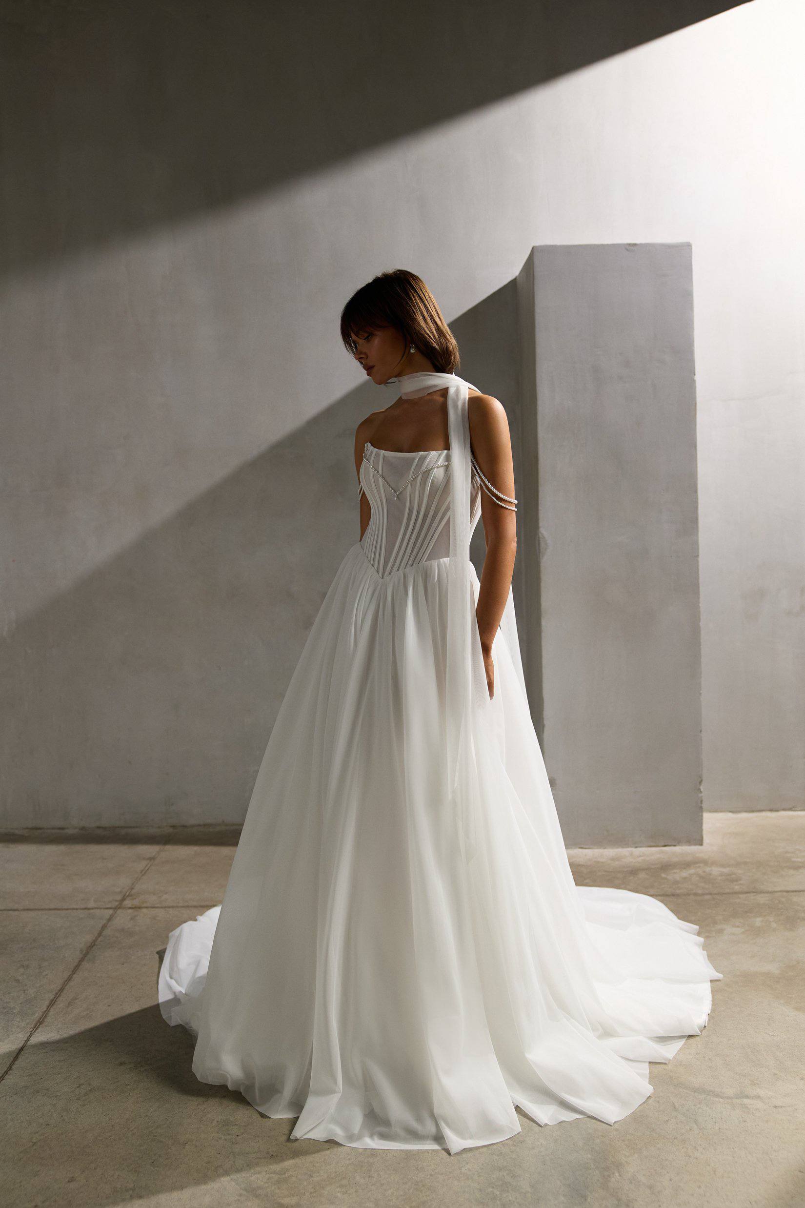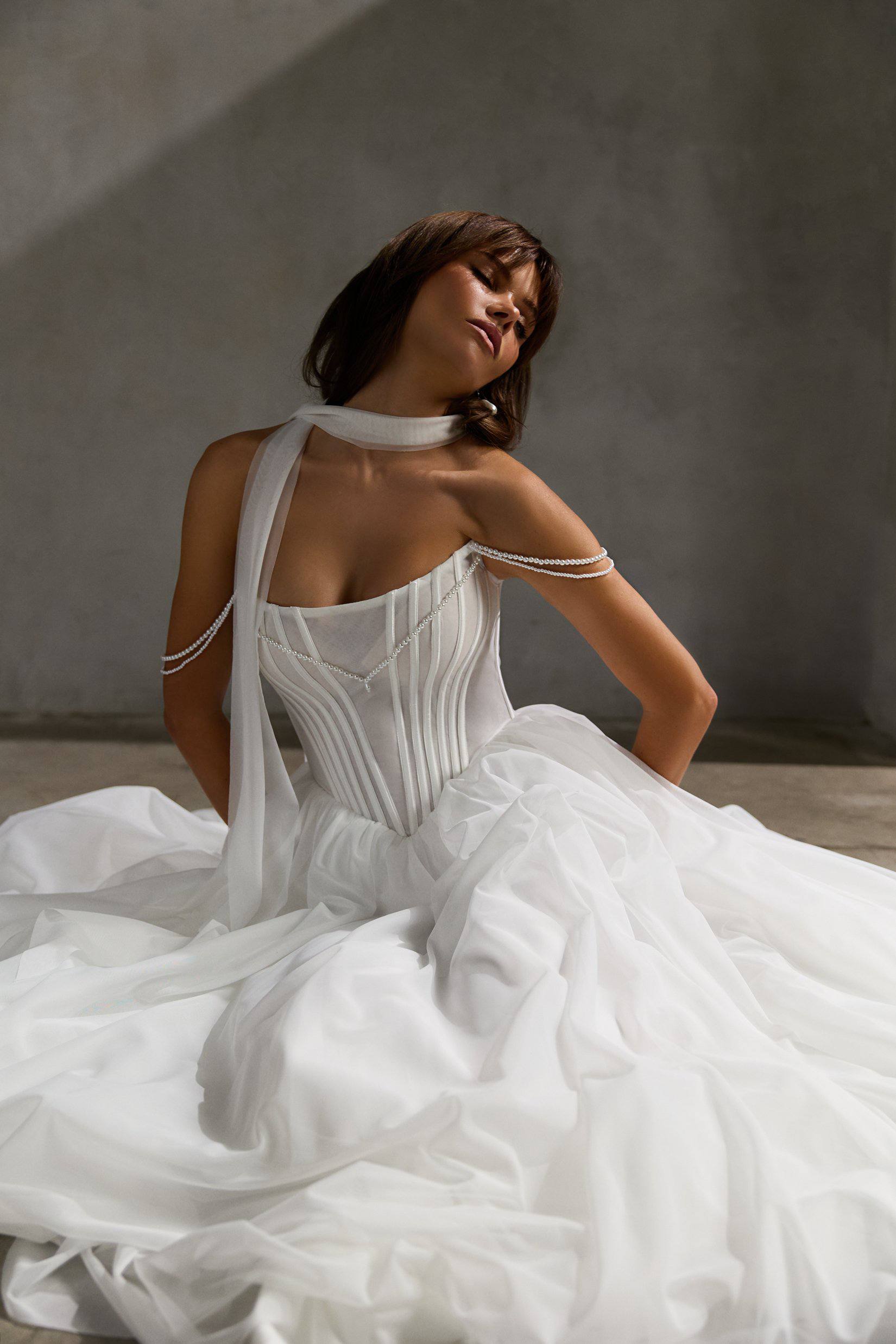 Свадебное платье на корсете. Лиф с мысом по переду, с глубоким декольте из кружева с жемчугом и пайетками, по талии бисерная тесьма. На спинке шнуровка. Юбка из фатина, пышная, молочная. Второй слой с блеском.