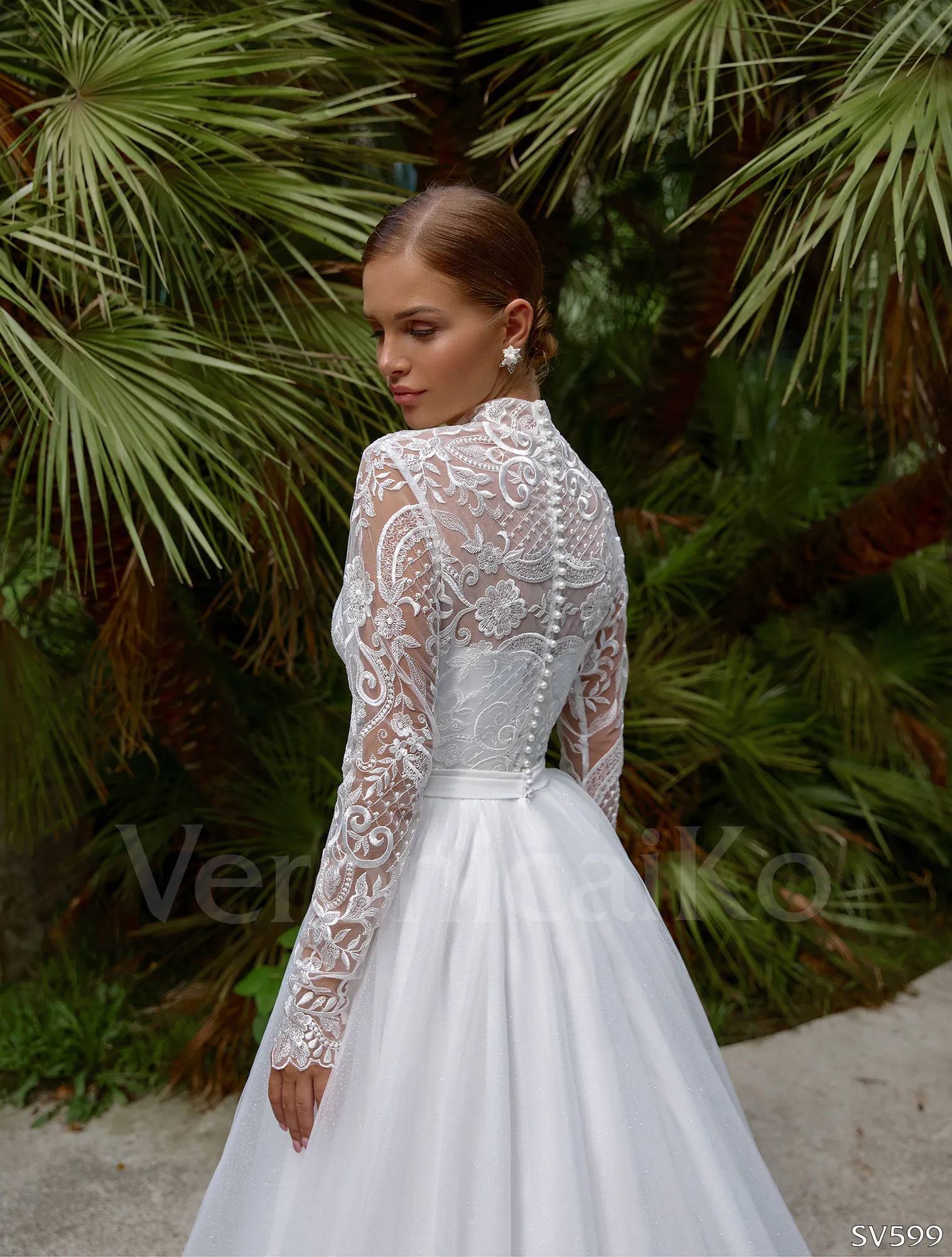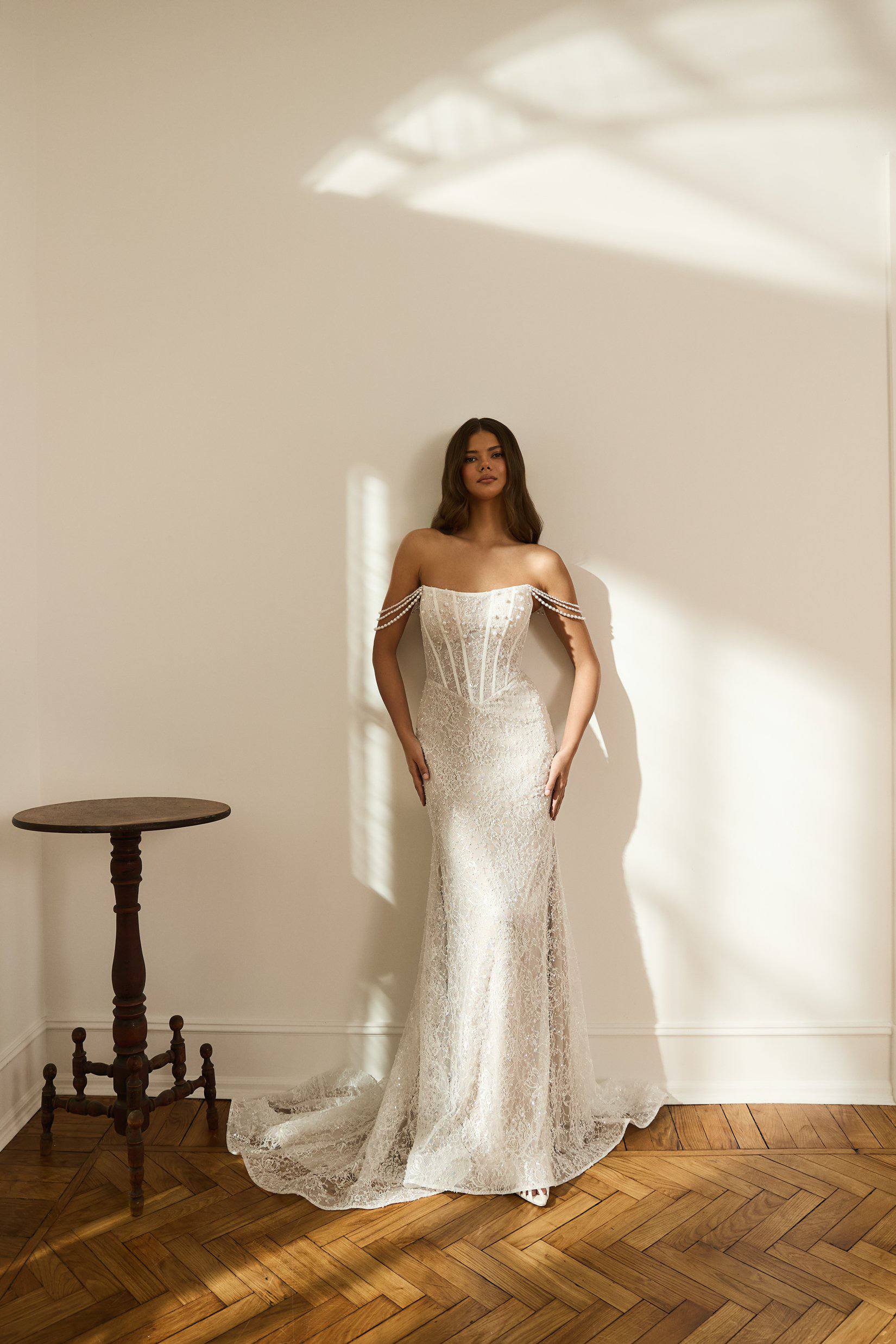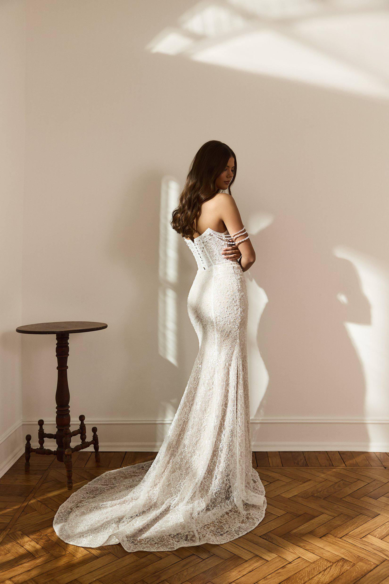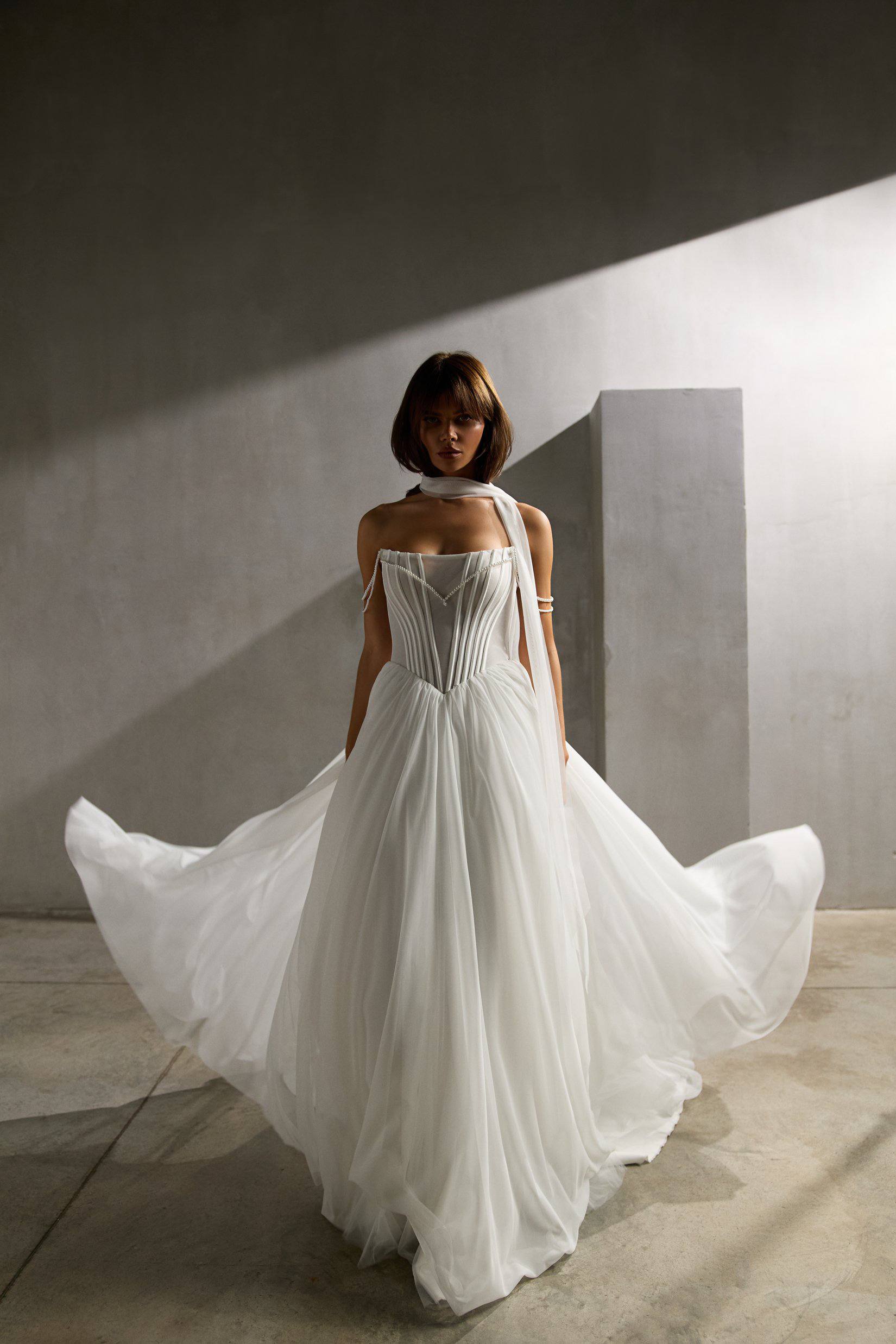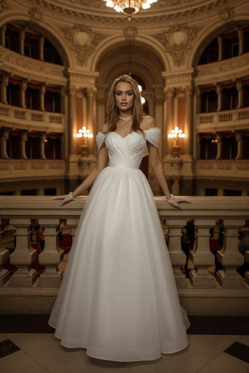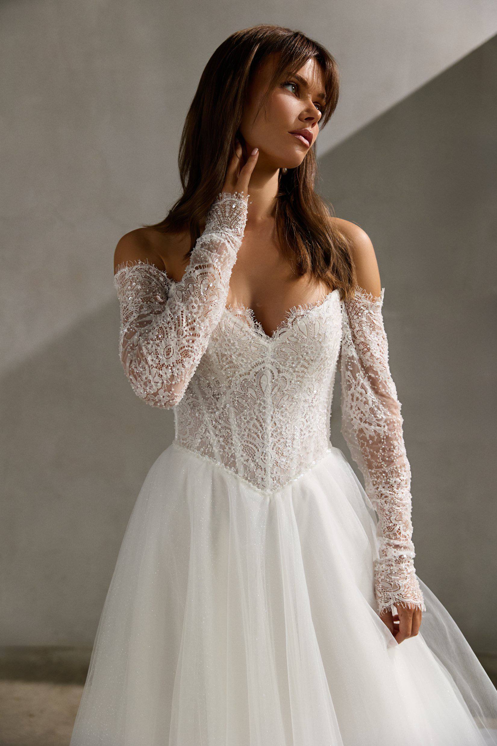 Свадебное платье на корсете. Лиф с мысом по переду, с глубоким декольте из кружева с жемчугом и пайетками, по талии бисерная тесьма. На спинке шнуровка. Юбка из фатина, пышная, молочная. Второй слой с блеском.