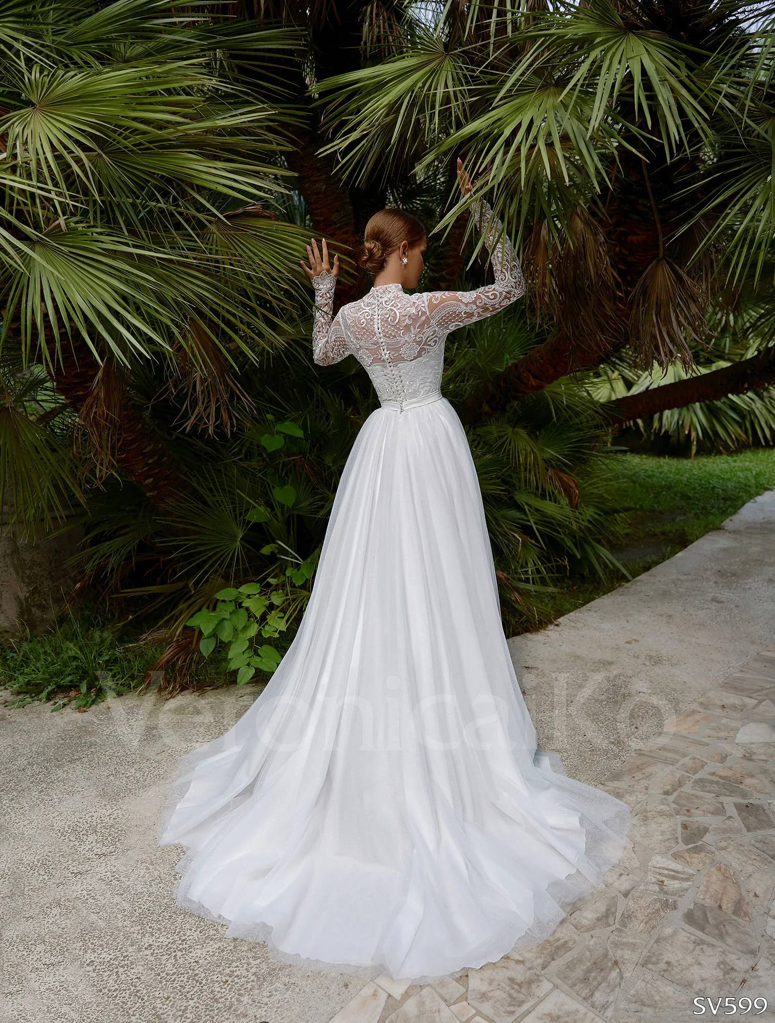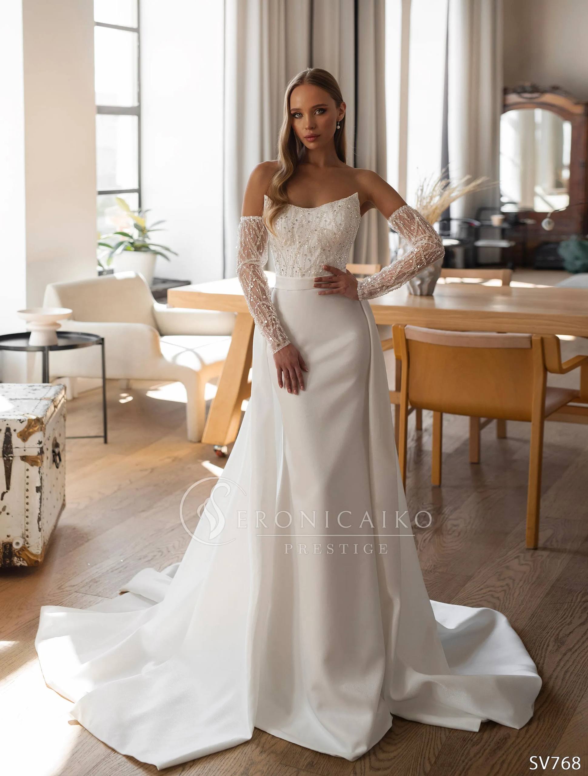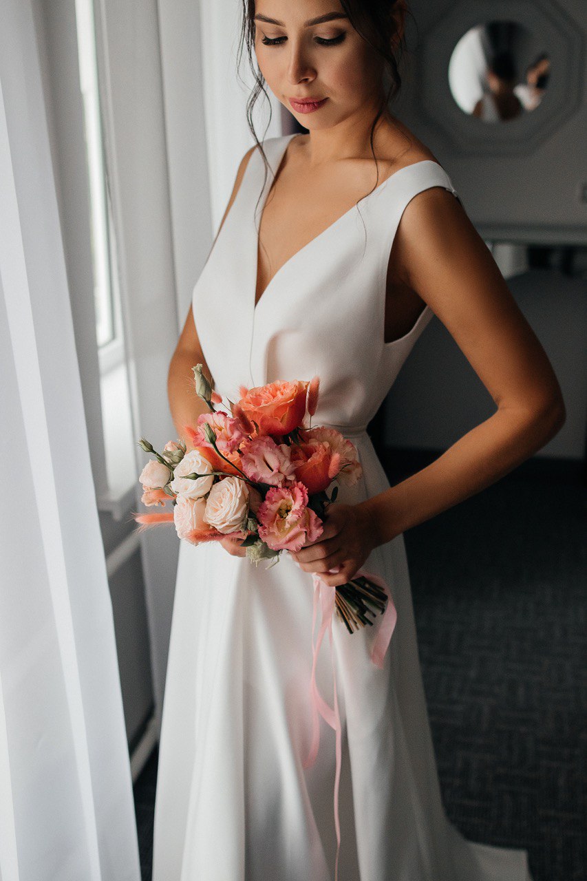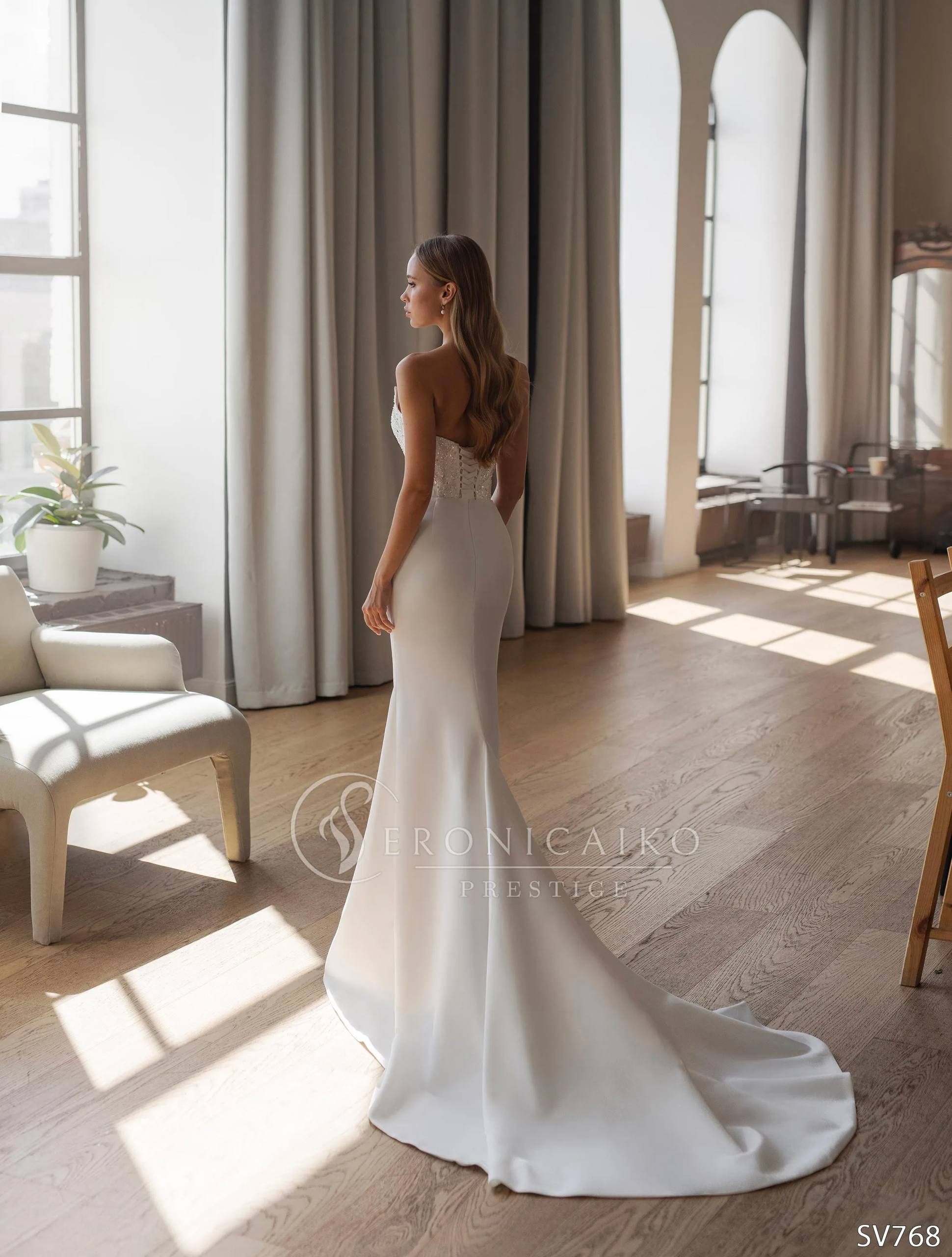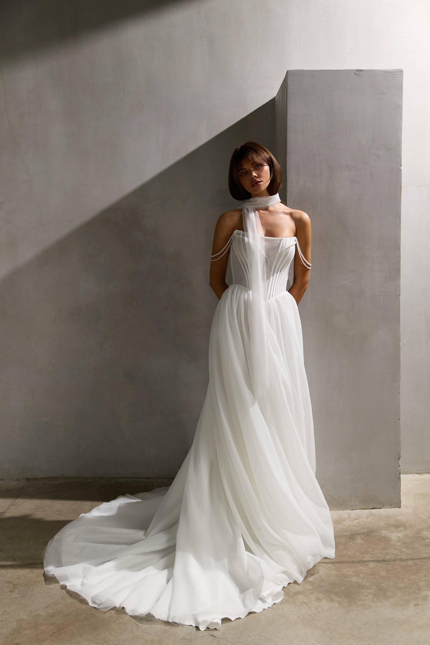 Свадебное платье на корсете. Лиф с мысом по переду, с глубоким декольте из кружева с жемчугом и пайетками, по талии бисерная тесьма. На спинке шнуровка. Юбка из фатина, пышная, молочная. Второй слой с блеском.