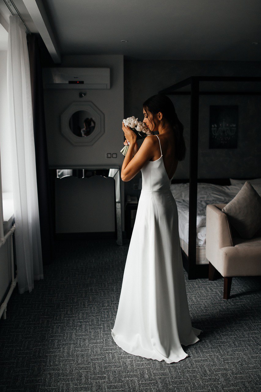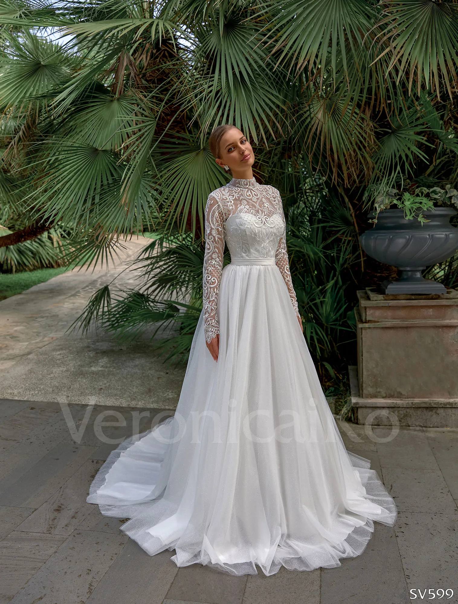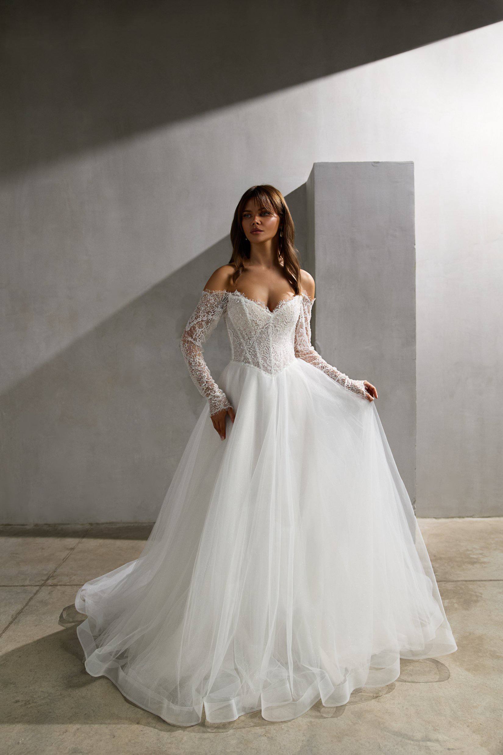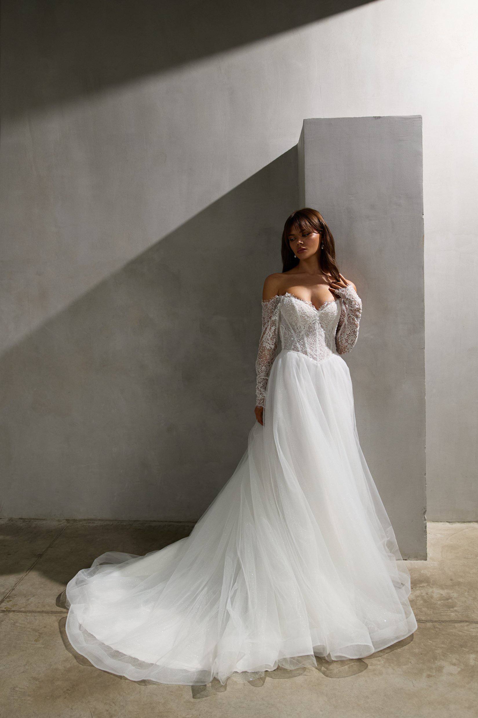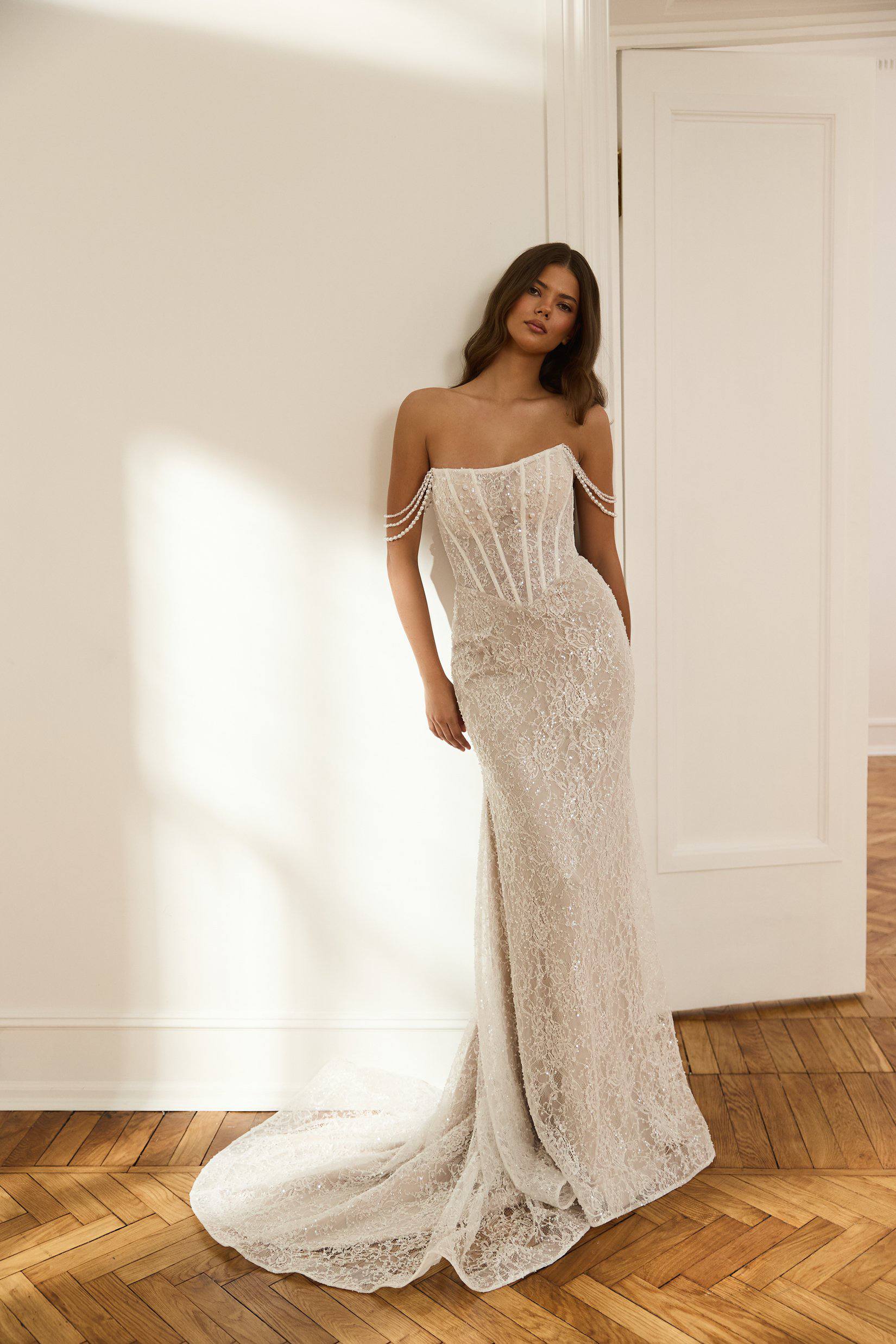 Свадебное платье на корсете. Лиф с мысом по переду, с глубоким декольте из кружева с жемчугом и пайетками, по талии бисерная тесьма. На спинке шнуровка. Юбка из фатина, пышная, молочная. Второй слой с блеском.